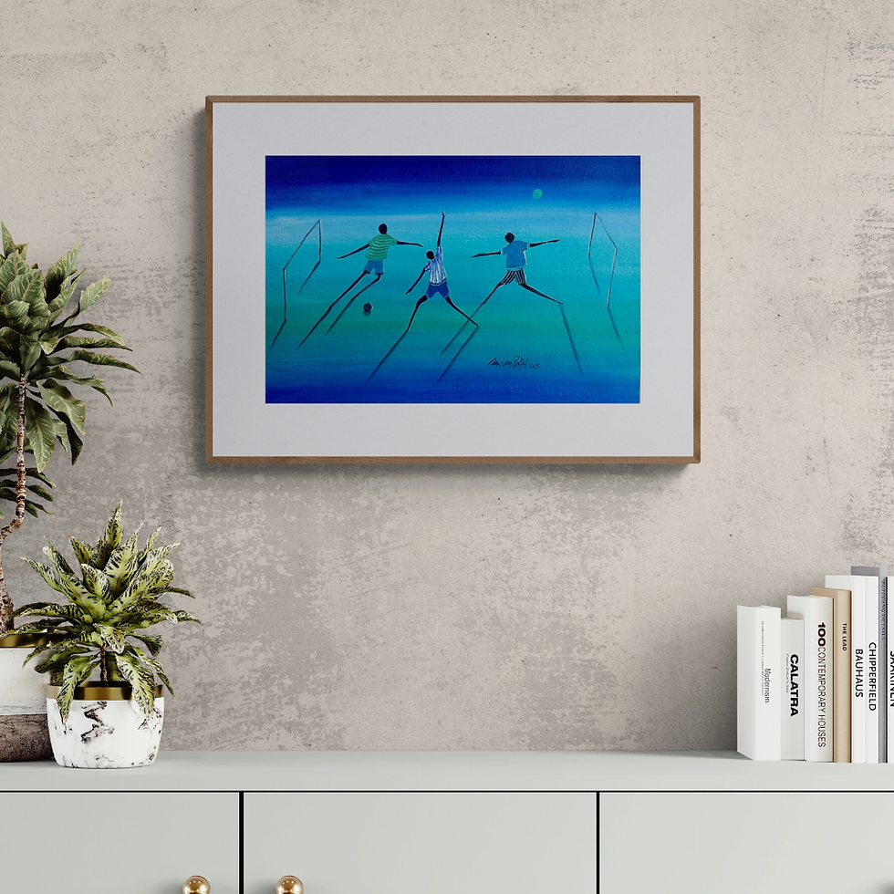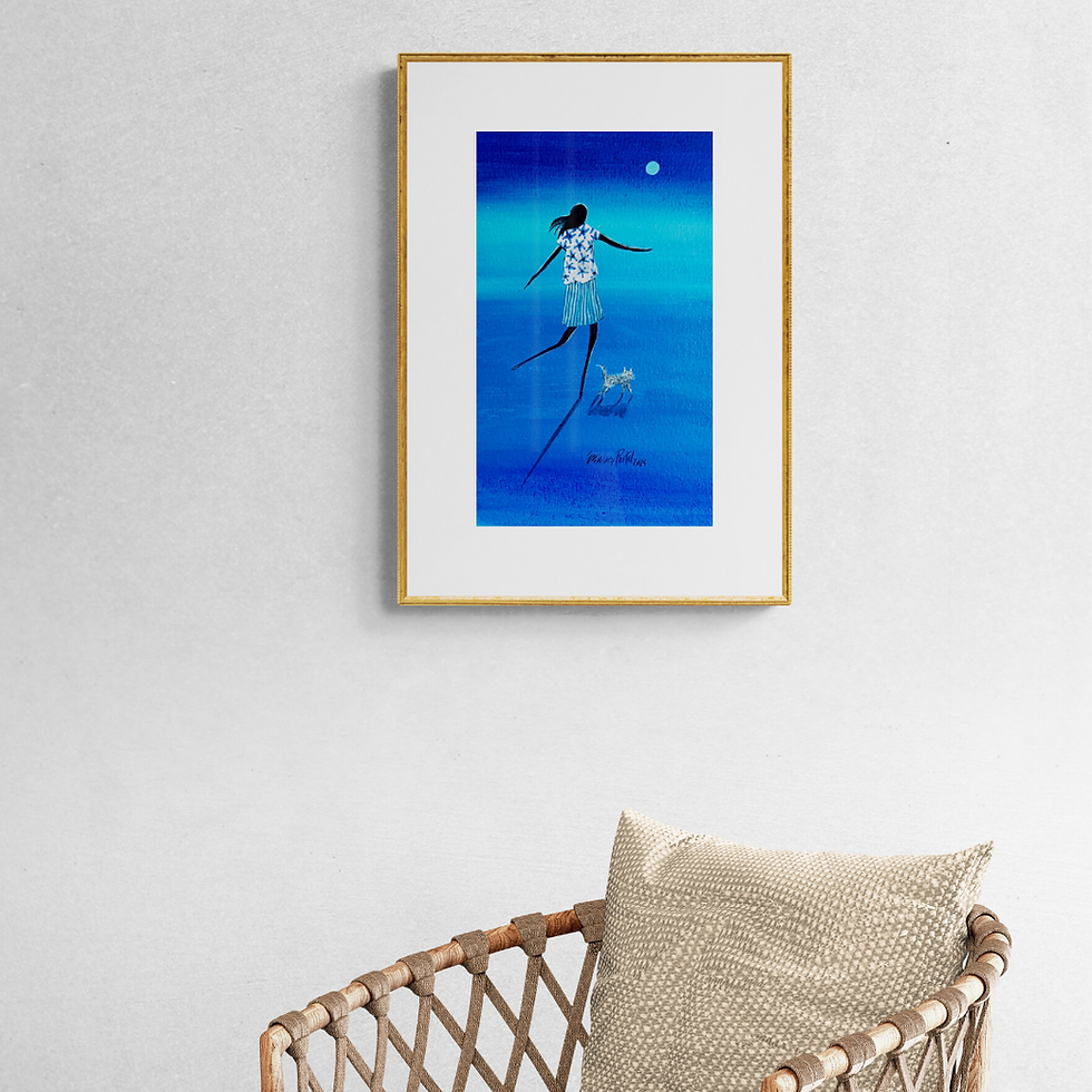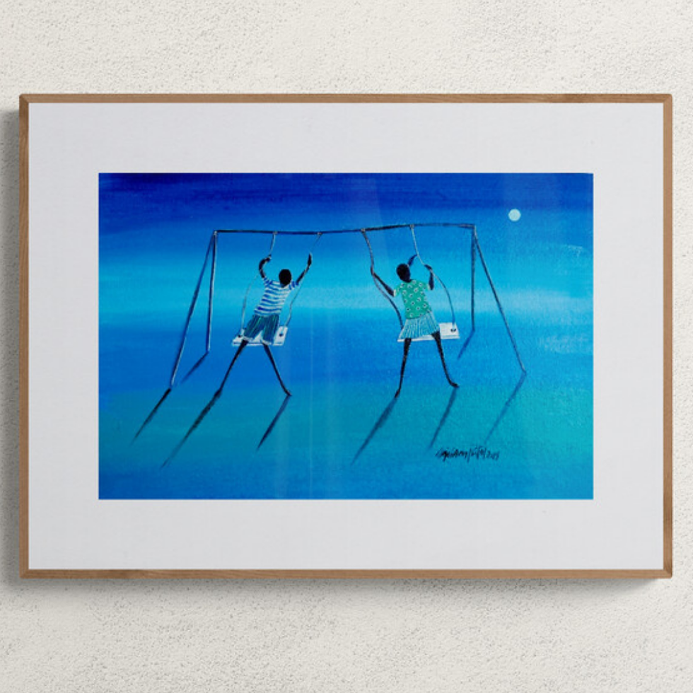 Nesta edição limitada, Miriam revisita seus primeiros traços — figuras magrinhas, saltitantes, monocromáticas, em tons de azul ou laranja. Manchas e traços que contavam histórias.